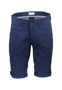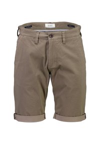 Pantaloni corti di cotone verde oliva con risvolti, tasche frontali e chiusura con bottone, abbinati a sneaker bianche.