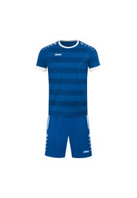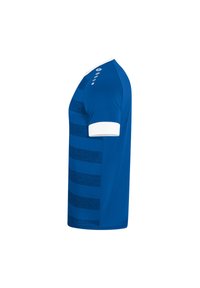 Maglia sportiva blu con strisce orizzontali di diverse tonalità. Presenta dettagli bianchi sul colletto e sulle maniche. Logo del marchio sul petto.