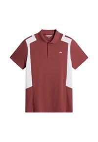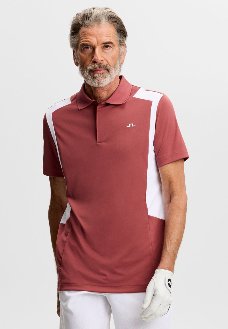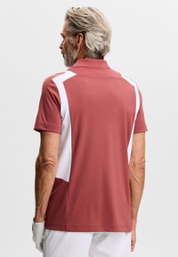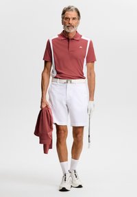 Polo rossa con pannelli laterali bianchi, maniche corte e colletto classico. Logo distintivo del marchio sul petto. Indossata con pantaloni bianchi e guanto da golf.