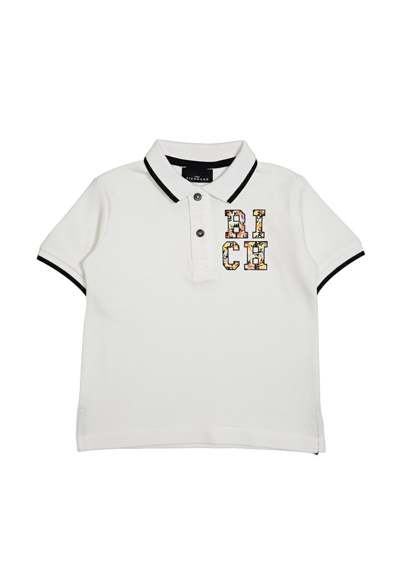 Polo bianca a maniche corte con rifiniture nere su colletto e maniche, due bottoni e scritta "RICH" a motivo floreale sul petto.