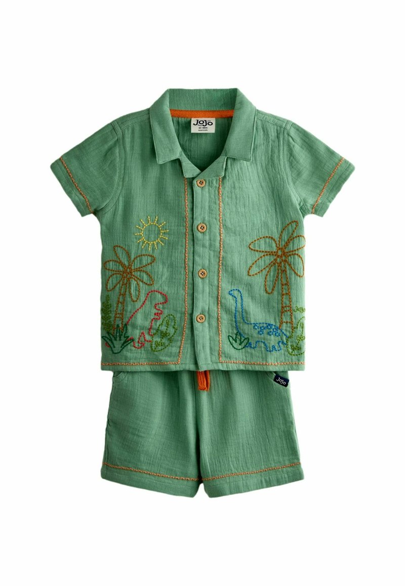 Set da bambino verde composta da maglietta e pantaloncini con dinosauri ricamati, palme, sole e dettagli di cuciture arancioni sulle maniche corte e sull'orlo.