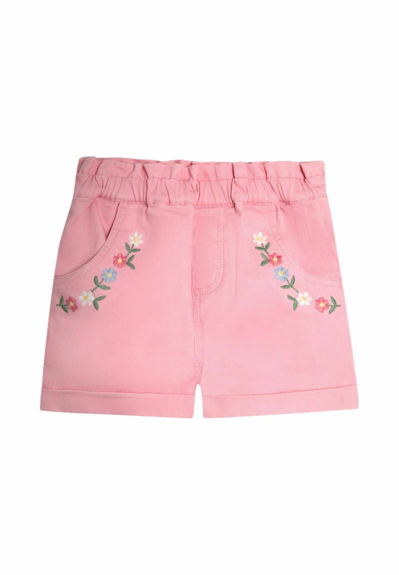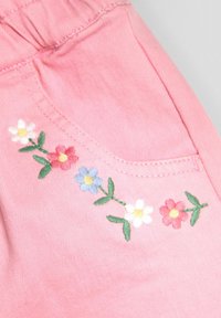 Pantaloncini rosa per bambini piccoli con vita elastica e ricami floreali sulle tasche anteriori.