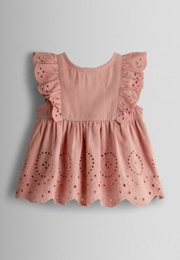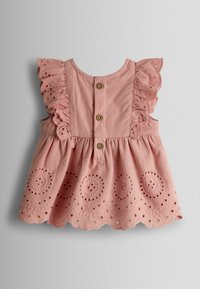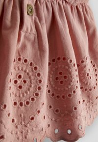 Set per neonato rosa con vestito in pizzo a occhielli con maniche arricciate, mutandine abbinate e fascia per capelli annodata.