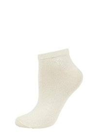 Coppia di calzini beige alla caviglia con bordi a coste e un piccolo logo ricamato vicino alla parte superiore su sfondo bianco.