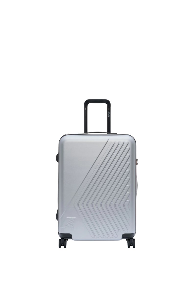 Valigia rigida argento con design diagonale a rilievo, quattro ruote e manico nero estensibile vista frontalmente.