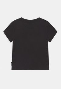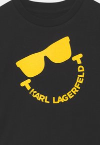 T-shirt nera a maniche corte con grafica di occhiali da sole gialli e testo "KARL LAGERFELD" curvato sotto gli occhiali sul davanti.