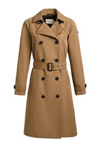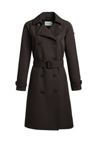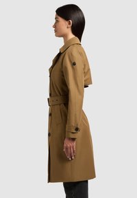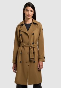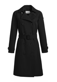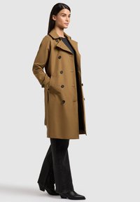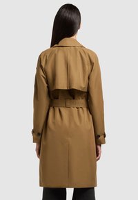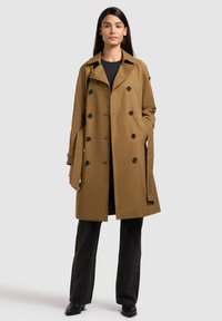 Donna con i capelli lunghi e scuri che indossa un trench color sabbia abbottonato e legato in vita sopra una maglia nera, in piedi davanti a uno sfondo chiaro uniforme.