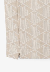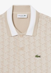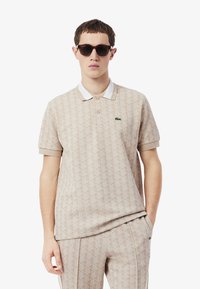 Polo beige con motivo a fantasia, colletto bianco, due bottoni e logo verde. La trama del tessuto sembra intrecciata, abbinata a pantaloni coordinati.