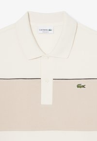 Polo color avorio con una fascia orizzontale color castagna, maniche corte e una pattina con due bottoni. Presenta un logo ricamato verde.