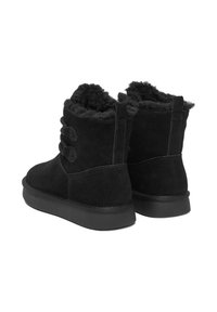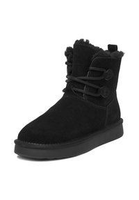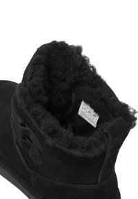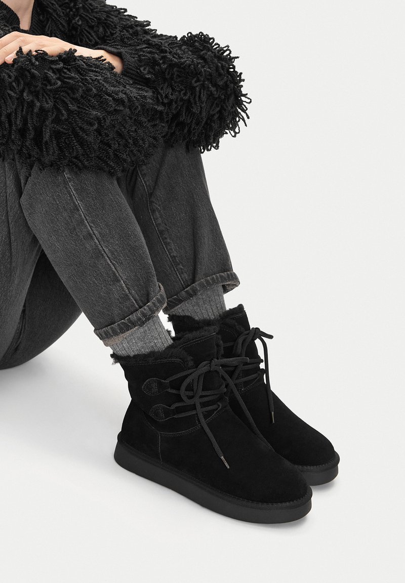 Persona seduta a gambe incrociate che indossa un maglione nero peloso, jeans scuri, calzini grigi e stivaletti in camoscio neri con fodera in pelliccia e lacci.