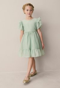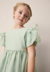 Vestito verde menta con maniche a sbuffo, corpetto arricciato e orlo a balze sovrapposte. Realizzato in tessuto leggero, con dettaglio di bottoni.
