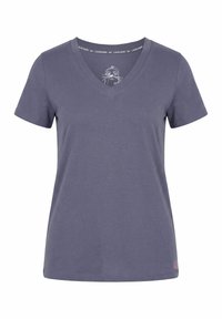 T-shirt azzurro chiaro a scollo a V realizzato in tessuto morbido, con maniche corte e vestibilità rilassata, abbinato a jeans blu. Logo evidente all'orlo.