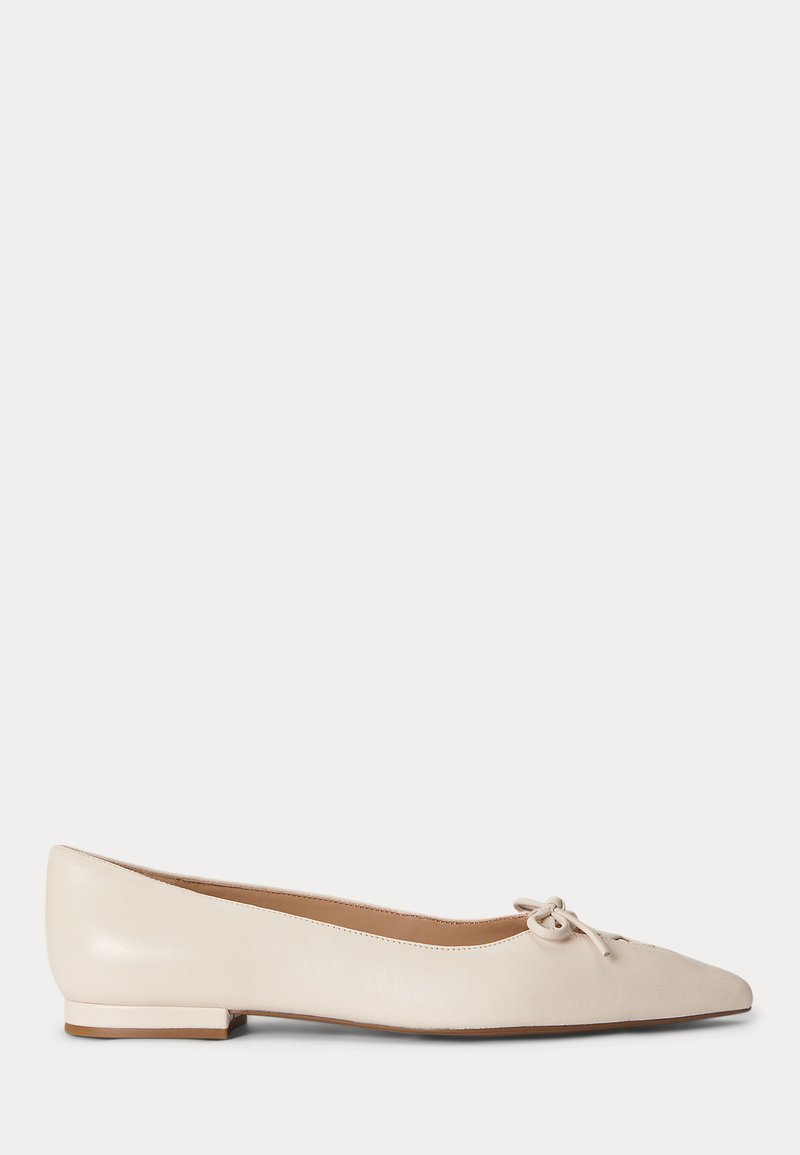 Scarpa piatta in pelle beige con punta affusolata, tacco basso e piccolo fiocco decorativo sulla parte superiore, mostrata di profilo su sfondo bianco.