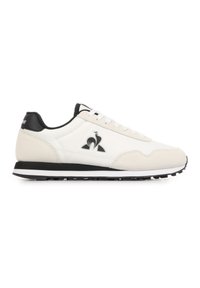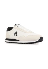 Sneaker bassa bianca e beige con dettagli neri, chiusura con lacci e logo di un gallo nero sul lato e sulla linguetta del tallone.