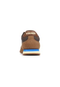 Scarpa da ginnastica bassa marrone e beige con suola testurizzata, lacci color crema, dettaglio azul sulla suola intermedia e logo stilizzato di un gallo sul lato.
