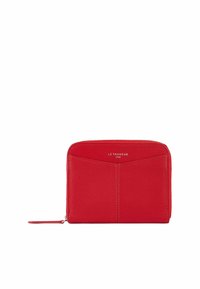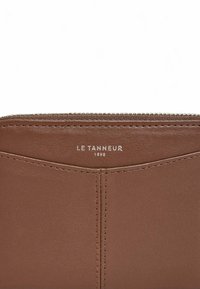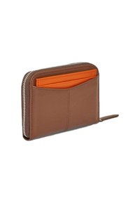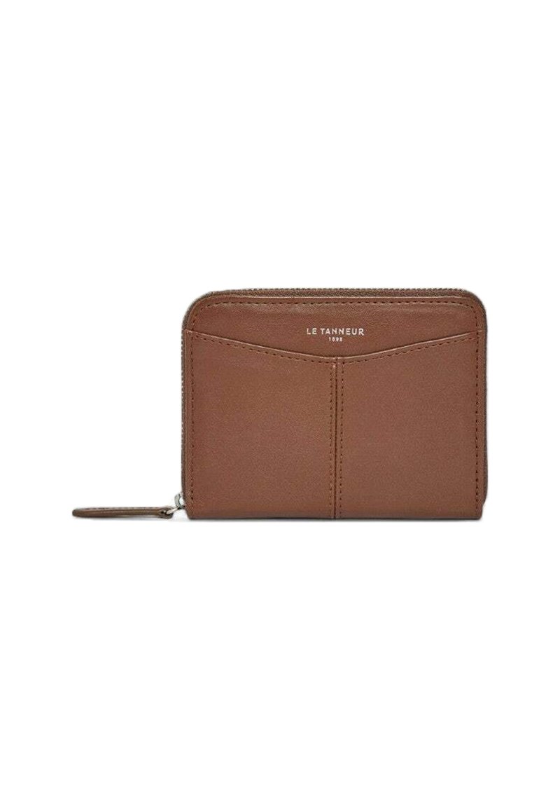 Portafoglio in pelle marrone con chiusura a zip, dotato di scomparti per carte sulla parte anteriore, cuciture discrete e logo impresso sulla superficie.