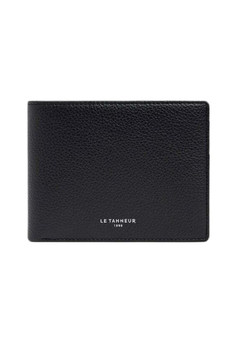 Portafoglio in pelle nera con superficie strutturata. Presenta un design semplice e il logo del marchio in rilievo al centro in basso.