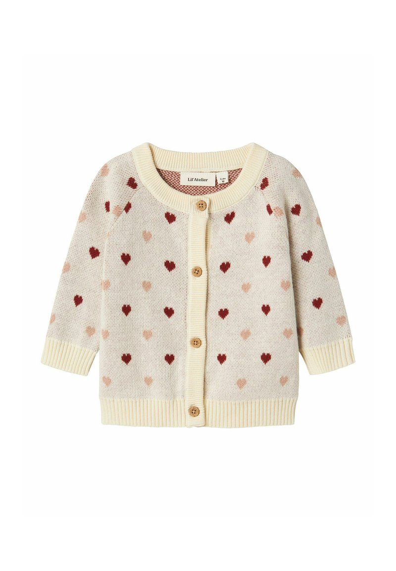 Cardigan di cotone con collo rotondo, base color crema, motivi a cuore sparsi in rosso e rosa, chiusura frontale con bottoni e polsini e orlo a costine.