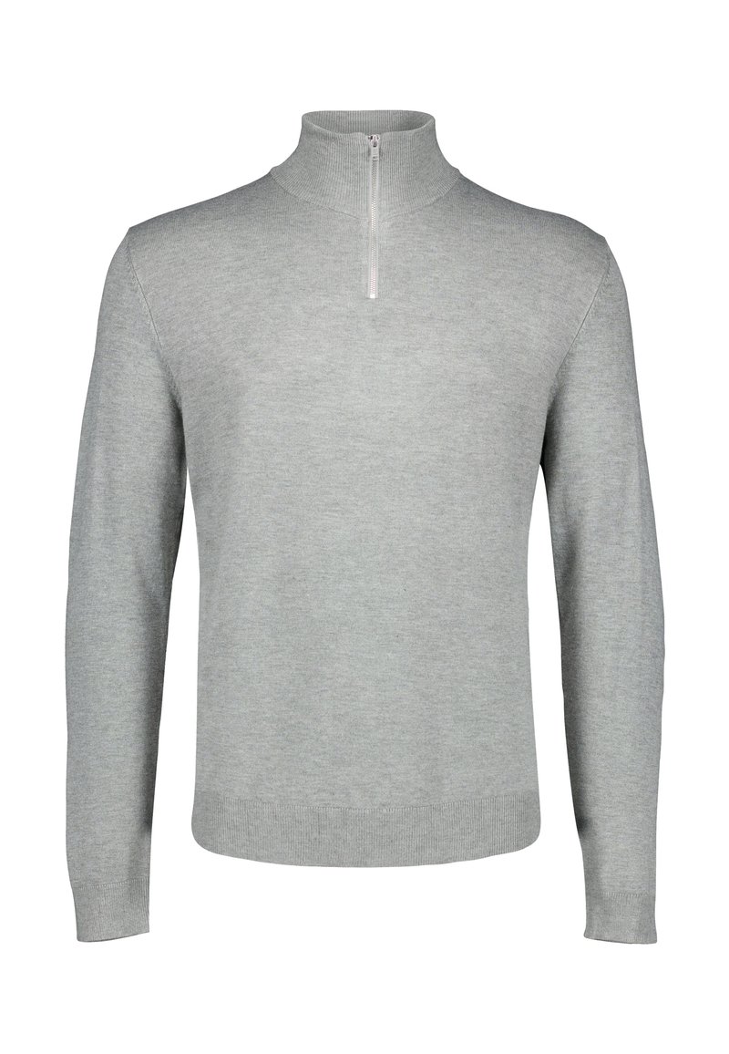 Maglione lavorato a maglia grigio chiaro a maniche lunghe con collo alto a coste e breve chiusura anteriore con cerniera.
