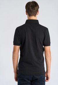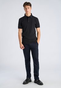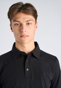 Giovane uomo con capelli corti castani che indossa una polo nera aderente e pantaloni scuri, in piedi davanti a uno sfondo grigio chiaro uniforme.