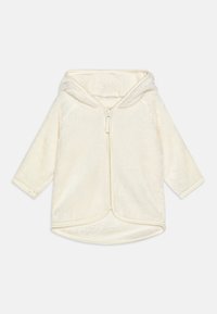 Giacca morbida per bambini in pile color crema con cappuccio e cerniera frontale, maniche lunghe e orlo arrotondato.