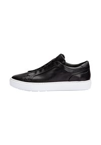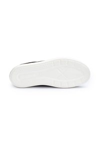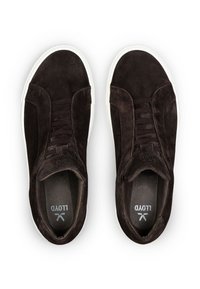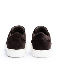 Sneaker in camoscio marrone scuro con suola in gomma bianca, design slip-on e cuciture minime, mostrata di lato su sfondo bianco.
