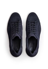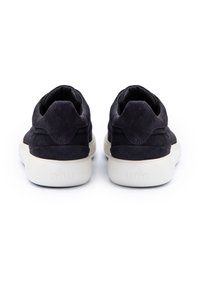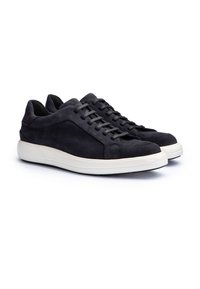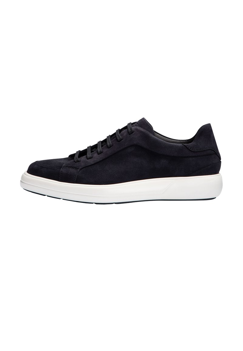 Sneaker in suede nero, modello basso con lacci neri, suola spessa bianca e design minimalista, vista laterale su sfondo bianco.