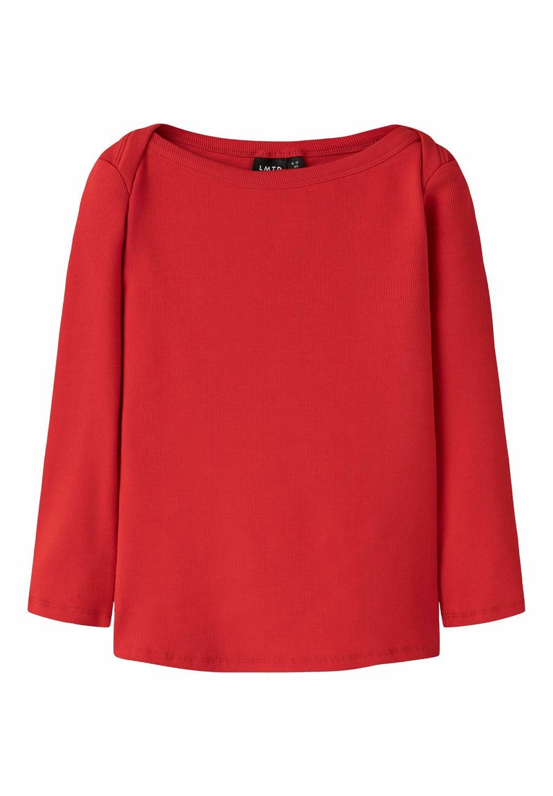 Maglia rossa a maniche lunghe in maglia costina, con scollo ampio e rotondo a girocollo e silhouette aderente.