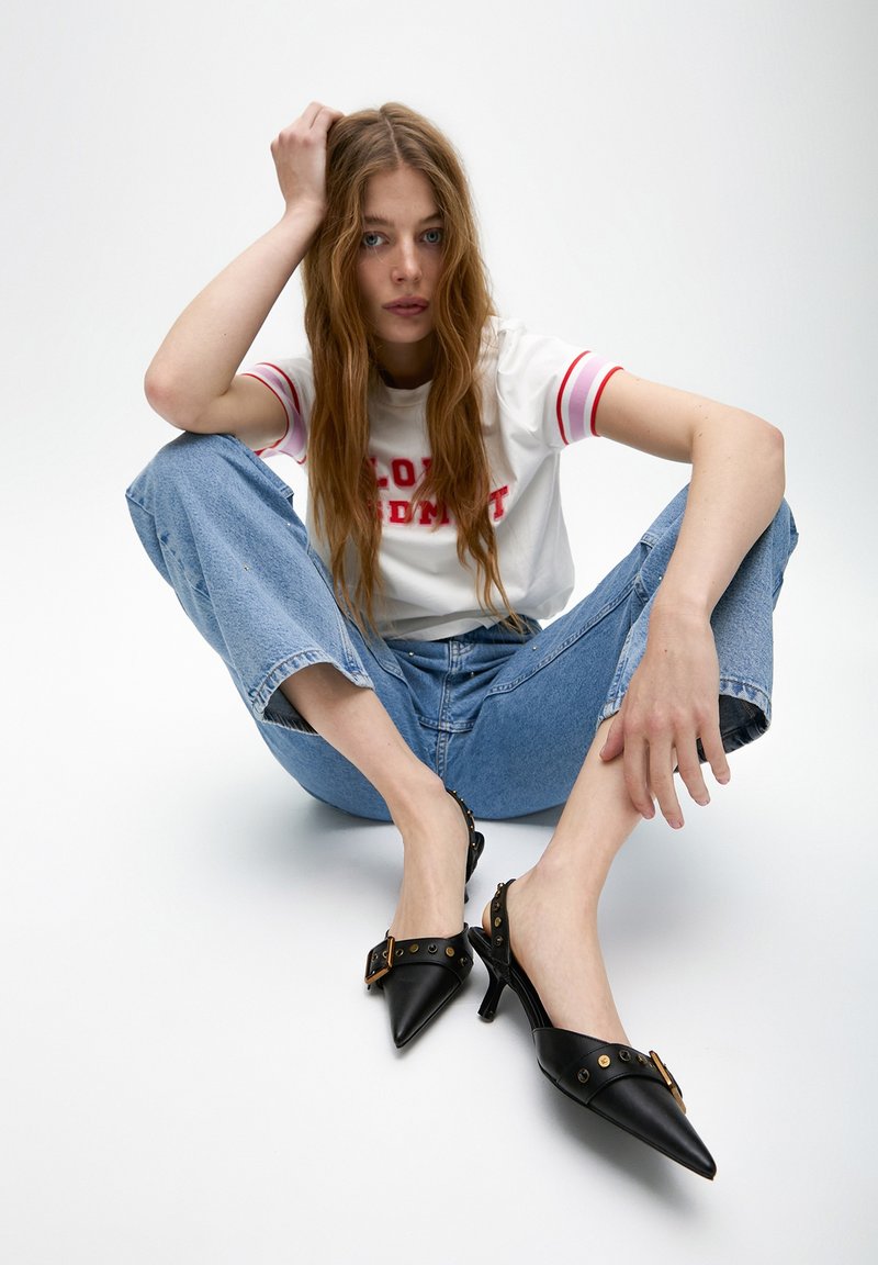 Eleganti décolleté a punta con un piccolo, sottile tacco. Dettagli con cinturini impreziositi da fibbie metalliche e borchie per un look chic e ribelle. Un pezzo femminile e moderno che combina comfort e stile. Misure per la taglia 38: Altezza tacco: 5 cm. Questo prodotto è fedele alla taglia, quindi consigliamo di acquistare la tua solita misura.