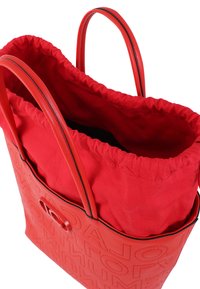 Borsa a mano rossa con logo in rilievo, texture morbida e chiusura superiore con coulisse. Dotata di doppi manici e interno spazioso.
