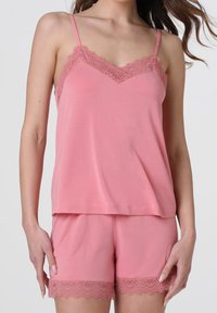Donna che indossa una camisole rosa con bordo in pizzo e pigiama corto abbinato, in piedi davanti a uno sfondo uniforme.