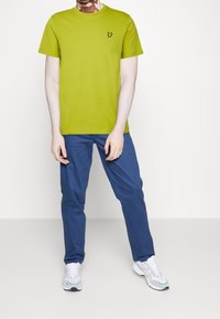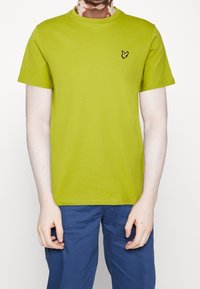 T-shirt a maniche corte, con collo rotondo, di cotone di un brillante verde lime, in cui è presente un piccolo logo di una farfalla nera e gialla sul lato sinistro del petto.
