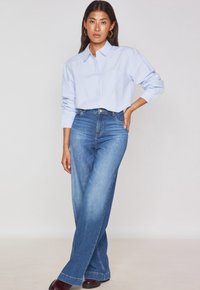 Camicia a righe blu chiaro con colletto, maniche lunghe arrotolate ai polsi e tasca applicata. Abbinata a jeans a vita alta.