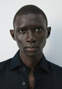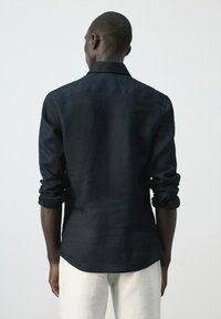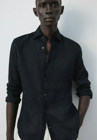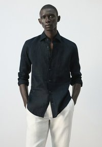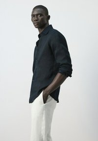 Uomo che indossa una camicia scura a maniche lunghe con bottoni e maniche arrotolate e pantaloni chiari, in piedi con le mani in tasca.