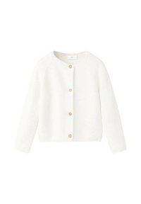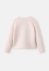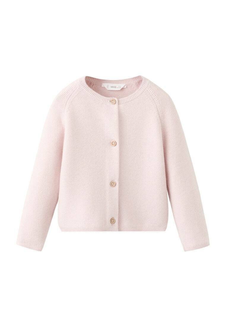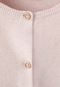 Cardigan lavorato a maglia di colore rosa chiaro con maniche lunghe, scollo rotondo e cinque bottoni in legno sulla parte frontale. Polsini e orlo a coste.