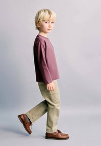Maglietta a maniche lunghe color marrone scuro per bambini, pantaloni beige e scarpe marroni con lacci. Tessuto leggero e liscio. Modello in piedi, profilo laterale.