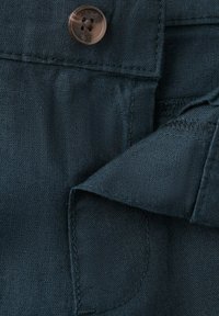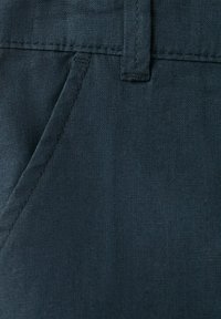 Pantaloni in cotone blu scuro con bottone frontale e passanti per cintura, dotati di due tasche laterali e design a gamba dritta.
