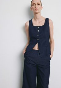 Donna che indossa un gilet senza maniche blu scuro con bottoni e pantaloni ampi abbinati, in piedi con le mani nelle tasche contro una parete chiara e liscia.
