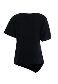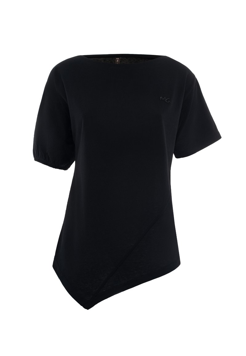 Maglietta nera a maniche corte con scollo rotondo e orlo asimmetrico, caratterizzata da un logo discreto sul petto. Tessuto morbido con una texture liscia.
