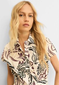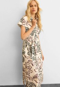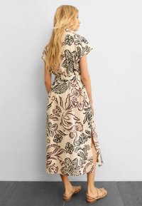 Donna bionda che indossa un abito camicia midi beige con motivi floreali scuri, tiene in mano una pochette con frange e indossa sandali beige con cinturini.