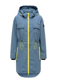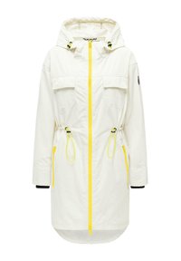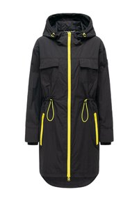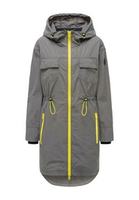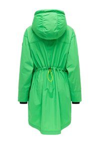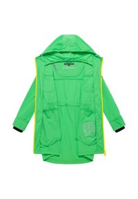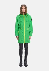 Giovane donna che indossa una giacca con cappuccio verde brillante con dettagli gialli sulla cerniera, top nero e jeans grigio scuro, in piedi davanti a uno sfondo bianco.