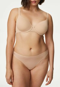 Donna che indossa un reggiseno nude coordinato con ferretto e mutandine stile bikini trasparenti su uno sfondo chiaro semplice.