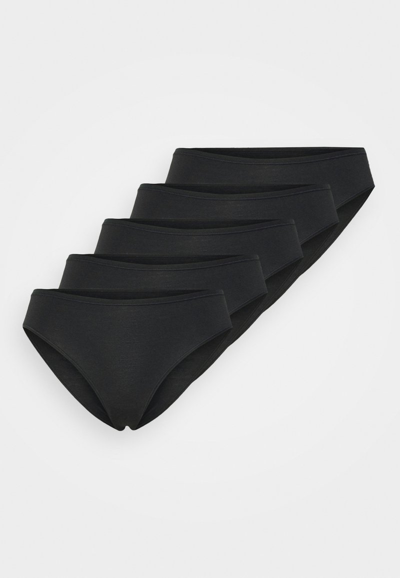 Cinque slip di cotone neri da donna, impilati diagonalmente su uno sfondo bianco.
