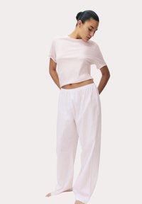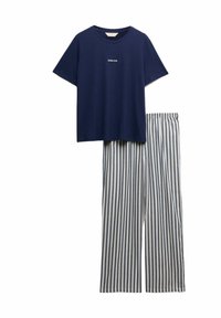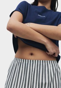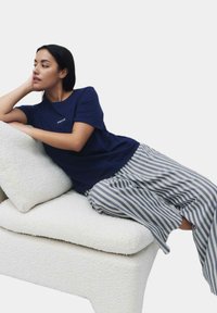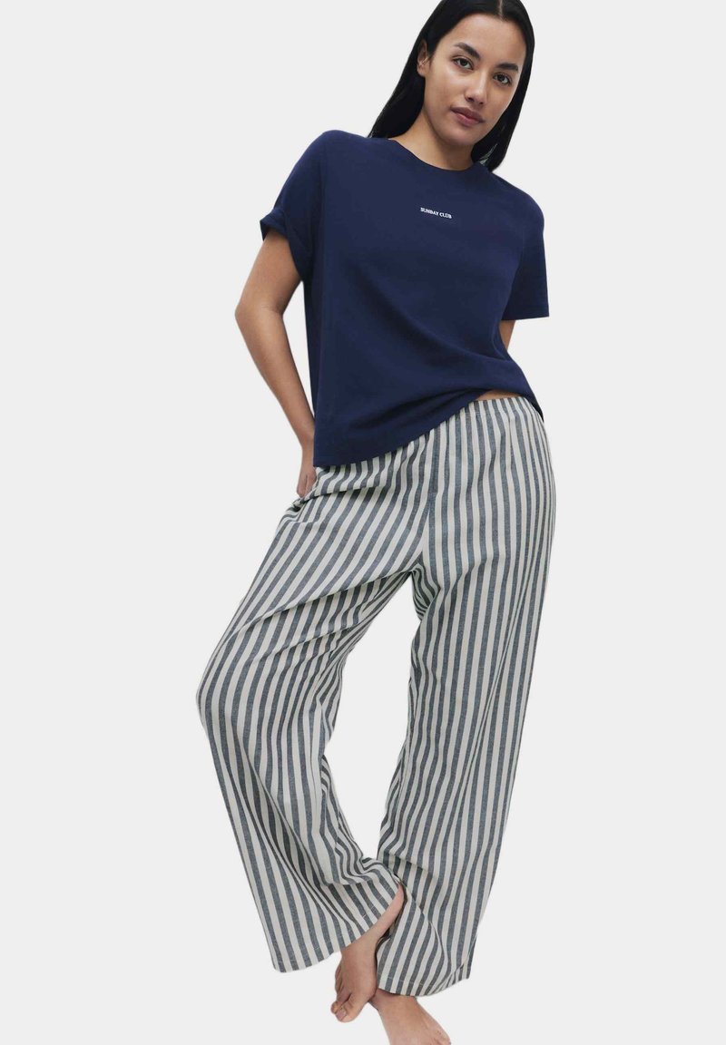 Donna che indossa una maglietta blu navy con la scritta "Sunday Club" e pantaloni a righe larghi e a vita alta, in piedi a piedi nudi su uno sfondo semplice.