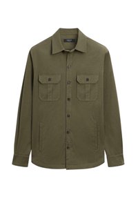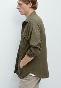 Giovane uomo in piedi che indossa una camicia verde oliva con bottoni, una maglietta bianca, pantaloni beige e mocassini neri su uno sfondo chiaro e uniforme.