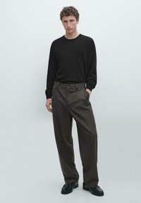 Maglione nero a maniche lunghe con scollo rotondo, tessuto morbido e vestibilità comoda, abbinato a pantaloni grigi larghi.