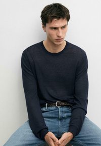 Uomo con maglione blu scuro a maniche lunghe e jeans blu con cintura intrecciata, in piedi davanti a uno sfondo chiaro e uniforme.