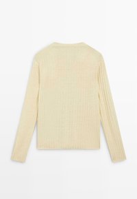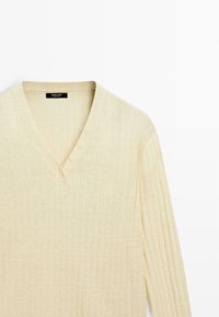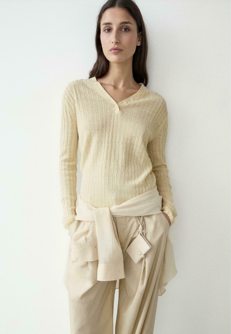 Scollo a V. Pullover in maglia realizzato in tessuto 100% lino. Maniche lunghe. Dettaglio di bottoni sul collo.