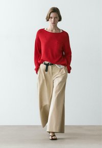 Giovane con capelli corti che indossa un maglione rosso e pantaloni beige, con le braccia incrociate, in piedi davanti a uno sfondo chiaro e uniforme.