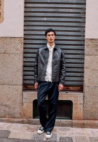 Giovane uomo con capelli ricci scuri che indossa una giacca di pelle nera e una camicia bianca in piedi su una strada, che guarda di lato.